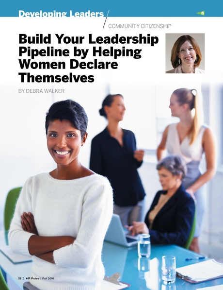 HR Pulse - Fall 2016 - (Page 28) Developing Leaders / COMMUNITY CITIZENSHIP Build Your Leadership Pipeline by Helping Women Declare Themselves BY DEBRA WALKER 28 ❯ HR Pulse Fall 2016 Table of Contents for the Digital Edition of HR Pulse - Fall 2016 ASHHRA First Word: Connect with Opportunity From ASHHRA: Associations Reflect Their Members HR Leaders’ Impact: Embracing Challenge ASHHRA Committee Involvement: Advocating for Positive Change Pursuing CHHR: Providing Support and Guidance Student Internship Program Delivers Two-Way Benefits Build Your Leadership Pipeline by Helping Women Declare Themselves Health Care Leadership: The Value of Proactively Preparing Employees for New Roles ASHHRA Capitol Hill Visit: Transforming Health Care Delivery How Hospitals are Helping Employees Tackle Medical School Debt ASHHRA 2015-2017 Strategic Initiatives Metrics in Health Care HR Buyer’s Guide and Advertisers’ Index HR Pulse - Fall 2016 http://www.nxtbook.com/naylor/AHHQ/AHHQ0118 http://www.nxtbook.com/naylor/AHHQ/AHHQ0417 http://www.nxtbook.com/naylor/AHHQ/AHHQ0317 http://www.nxtbook.com/naylor/AHHQ/AHHQ0217 http://www.nxtbook.com/naylor/AHHQ/AHHQ0117 http://www.nxtbook.com/naylor/AHHQ/AHHQ0416 http://www.nxtbook.com/naylor/AHHQ/AHHQ0316 http://www.nxtbook.com/naylor/AHHQ/AHHQ0216 http://www.nxtbook.com/naylor/AHHQ/AHHQ0116 http://www.nxtbook.com/naylor/AHHQ/AHHQ0415 http://www.nxtbook.com/naylor/AHHQ/AHHQ0315 http://www.nxtbook.com/naylor/AHHQ/AHHQ0215 http://www.nxtbook.com/naylor/AHHQ/AHHQ0115 http://www.nxtbook.com/naylor/AHHQ/AHHQ0414 http://www.nxtbook.com/naylor/AHHQ/AHHQ0314 http://www.nxtbook.com/naylor/AHHQ/AHHQ0214 http://www.nxtbook.com/naylor/AHHQ/AHHQ0114 http://www.nxtbook.com/naylor/AHHQ/AHHQ0413 http://www.nxtbook.com/naylor/AHHQ/AHHQ0313 http://www.nxtbook.com/naylor/AHHQ/AHHQ0213 http://www.nxtbook.com/nxtbooks/naylor/AHHQ0113 http://www.nxtbook.com/nxtbooks/naylor/AHHQ0412 http://www.nxtbook.com/nxtbooks/naylor/AHHQ0312 http://www.nxtbook.com/nxtbooks/naylor/AHHQ0212 http://www.nxtbook.com/nxtbooks/naylor/AHHQ0112 http://www.nxtbook.com/nxtbooks/naylor/AHHQ0411 http://www.nxtbook.com/nxtbooks/naylor/AHHQ0311 http://www.nxtbook.com/nxtbooks/naylor/AHHQ0211 http://www.nxtbook.com/nxtbooks/naylor/AHHQ0111 http://www.nxtbook.com/nxtbooks/naylor/AHHQ0410 http://www.nxtbook.com/nxtbooks/naylor/AHHQ0310 http://www.nxtbook.com/nxtbooks/naylor/AHHQ0210 http://www.nxtbook.com/nxtbooks/naylor/AHHQ0110 http://www.nxtbook.com/nxtbooks/naylor/AHHQ0409 http://www.nxtbook.com/nxtbooks/naylor/AHHQ0309 http://www.nxtbook.com/nxtbooks/naylor/AHHQ0209 http://www.nxtbook.com/nxtbooks/naylor/AHHQ0109 http://www.nxtbook.com/nxtbooks/naylor/AHHQ0408 http://www.nxtbook.com/nxtbooks/naylor/AHHQ0308 http://www.nxtbook.com/nxtbooks/naylor/AHHQ0208 http://www.nxtbook.com/nxtbooks/naylor/AHHQ0108 http://www.nxtbook.com/nxtbooks/naylor/AHHQ0407 http://www.nxtbook.com/nxtbooks/naylor/AHHQ0307 http://www.nxtbook.com/nxtbooks/naylor/AHHQ0207 http://www.nxtbookMEDIA.com