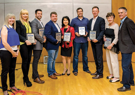 The RTA Alumni Association (RTAAA) hosted the annual Wall of Fame. From left: Donna Morrison, president, RTAAA; 2016 Wall of Fame inductees: Jessica Holmes ’98, Matt Bishop ’02, Blair Powers ’02, Jennifer Lynn ’81, J.J. Johnson ’02, Mark Milliere ’88, Sheila Darling accepting for Ted Darling ’58, who passed away, and Michael Coutanche, chair, RTA School of Media.