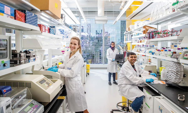 Co-op, undergrad and graduate students Vika Bardal, Farah Choudhary and Biprajit Sanyal at work in the university's new 20,000-squarefoot science research facility at Toronto's MaRS Discovery District.