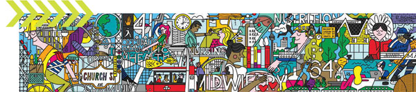 Last fall, Ryerson installed illustrated hoarding around the construction site of the Daphne Cockwell Health Sciences Complex at Dundas and Church Streets. Students from residence and the Faculty of Community Services coloured a section of the illustration.